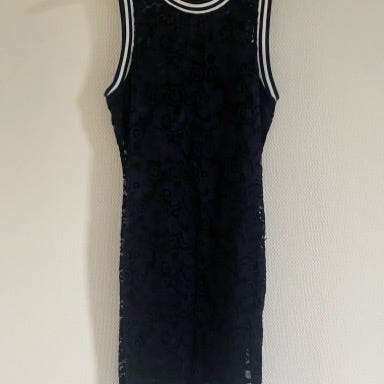 Virkelig smuk kjole perfekt til festen!. Kjolen har mange flotte blondet detaljer samt en underkjole. Den lukket via en lynlås på ryggen.