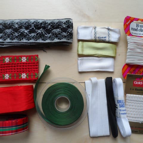 Bånd, en blandet pose med kantbånd, skråbånd, pyntebånd, bændler, et par kvaster, lidt blondekanter m.m. / sender gerne