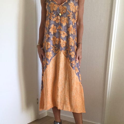 Kjolen er lavet af genanvendte sarier. Alle sarier er håndplukkede af Sissel Edelbo, og er, før de blev re-designet, blevet båret af en indisk kvinde. Kvindens og sariens historie viser sig i de unikke mønstre og små karakteristika. Ved at bære denne smukke kjole fra Sissel Edelbo fortæller du historien videre.