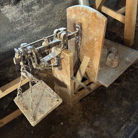 Vægt op til 250 kg, Antik, H.O.Rasmussen vægtefabrik, København, Antik mølleri vægt. God og kraftig vægt, vejer præcist, og op til 250 kg. Nylonhjul, og drejelige hjul. Vægten har været i drift på Eskilstrup Hollandske Mølle.