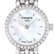 Dameur, Tissot, Tissot PR 100 Sport Chic - safirglas, urkasse i rustfritnstål/gul coating, hvid perlemor urskive med 12 Top Wesselton VS-SI (0,0456ct) brillianter, 36mm i diameter. Meget sparsomt brugt.