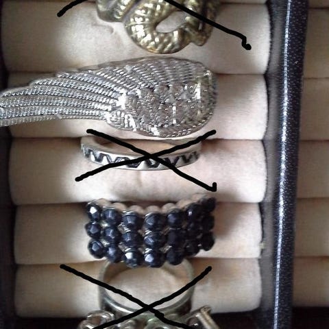 Ring, bijouteri, Bling bling ringe. Storfacetsleben sten i midten omkranset af mindre facetslebne stene. En klar g en lyseblå variant. Ringstørrelse ca 54 men som det ses er de af typen men selv kan udvide. Diameter på toppen 16mm Som nye. Pris kr 40 pr stk.
