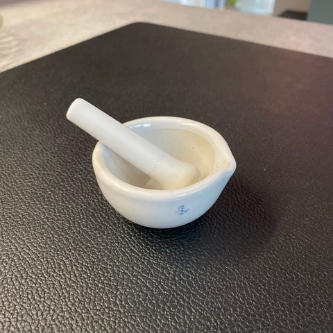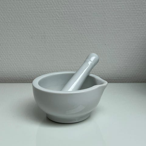 Porcelæn, Morter, Lille morter i hvidt porcelæn. Brugt meget få gange. Skålen er 12 cm i diameter.