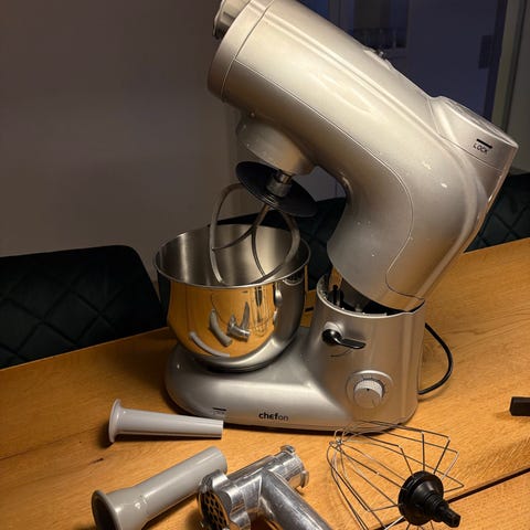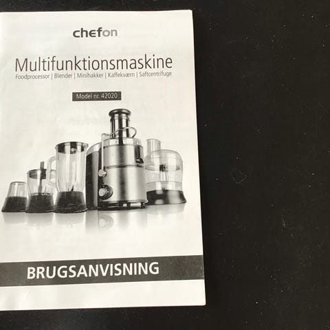 Køkkenmaskine, Chefon, Køkkenmaskine fra Chefon inkl. dejkrog, piskeris og spatel, samt blender. Den er ubrugt og standen derfor som ny.