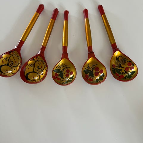 Andet, Russisk skeerne, 3ka, 4 styks original russisk træ skeer, russisk lak, handmålet længde 19 cm og 6 cm i bredden plus 1 træ skeer, russisk lak, håndmalet, 19 cm længde og ca. 6 cm i bredden