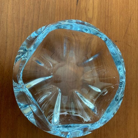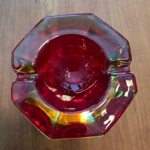 Glas, Askebæger, Lille fint askebæger i klar glas i røde og hvide toner, fuldstændig som nyt fra 1960’erne.
