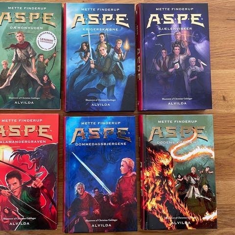 - Mette Finderup: Aspe Dæmonhunden. Nr. 1 i serie om Aspe. Hårdt omslag. Næsten som ny. 30 kr.