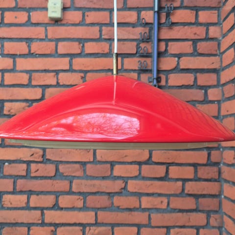 Knaldrød retrolampe med et bredt og svævende udtryk og et effektivt lys nedadtil. Lampen har almindelige aldersrelaterede brugsspor som lettere overfladeridser og enkelte afslag i malingen, primært omkring aflasteren i toppen.