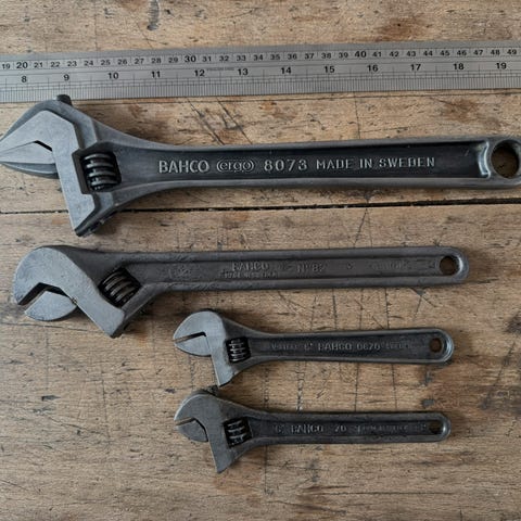 Skruenøgle, Bacho, 1 stk Bacho 8 tommer Svensknøgle Kr 70 1 stk Ring/Gaffelnøgle 24-26 mm kr 20 1 stk Ring/gaffelnøgle 25 mm kr 20 2 stk Lægt hamre pr stk kr 40 2 stk Mejsler pr stk kr 20 1 stk Firkantet fil kr 20