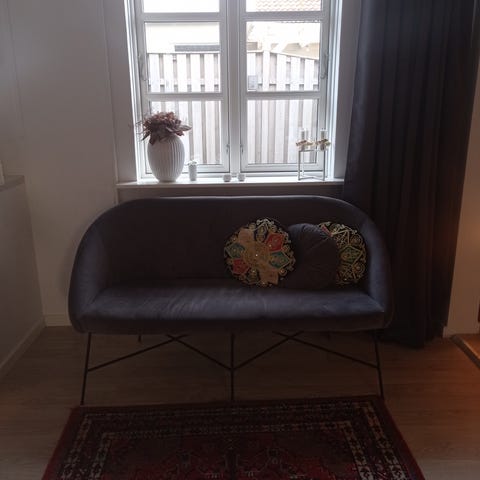 Sofa/sofabænk i blå velour stof og med 6 metalben.