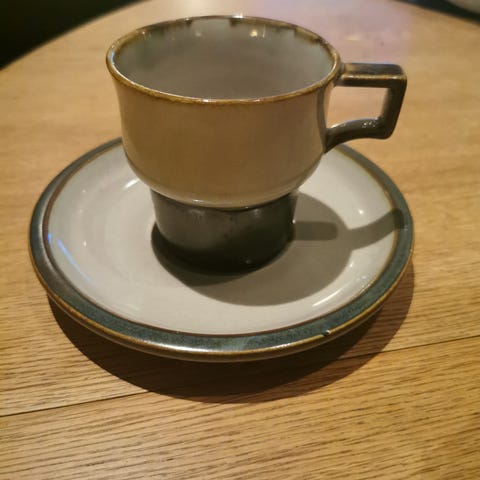 Mål Kop: 6,5 cm x 8 cm dia. Underkop: 13,5 cm Stand ..som nyt..
