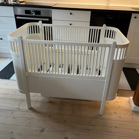 Juniorseng, Junoseng, Junoseng, Lille-Per-seng, har oprindelig været blå, men er malet hvid. Trænger til ny maling. Sengen har ikke den originale bund og mangler desuden tremmerne. Den kan derfor umiddelbart kun bruges som juniorseng. Afhentes i Holbæk hurtigst muligt.