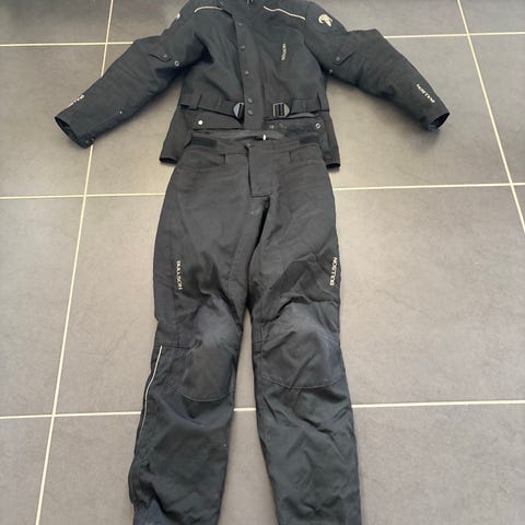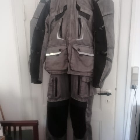Dragt, BF Motorcycle, Jakke og bukser sælges. Jakke er angivet til størrelse S og bukser XL. Jeg er selv 174 cm høj og normal af bygning og passer begge dele fint. Begge dele har termofoer, der kan lynes af, så det kan bruges i alle sæsoner. Delene er brugte, men helt intakte uden huller eller lignende. Der er lommer til rygskjold og pads.