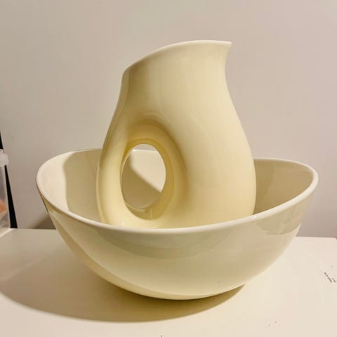 Porcelæn, skål og kande, med frugtmotiver og guldkant, skålen måler 19,5 cm og 6 cm i højden, og kanden måler 11,5 cm i højden.