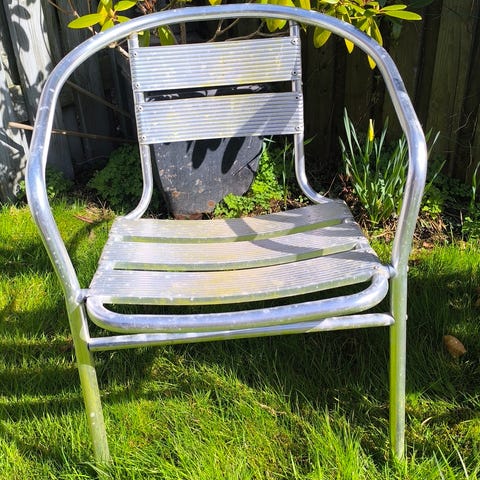 Havestole, Ukendt, Aluminium og stof, Meget let sammenklappelig stol. Aluminium og blåt stof med sort skum på armlæn.