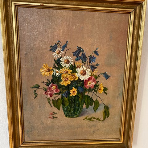 Oliemaleri, Kamma Brendekilde, motiv: Blomster/Have, stil: Stilleben, b: 35 h: 45, Blomster malet af Kamma Brendekilde, datteren af Hans Andersen Brendekilde.
