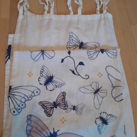 Gardin, b: 124 h: 87, To børnegardiner af ikeastof. Der er syet gardinbånd/rynkebånd i, så de er lige til at hænge op. Der medfølger også resten af stoffet, det måler 126 x 111 cm. Der er en lille plet på det ene gardin, som jeg ikke har forsøgt at fjerne.