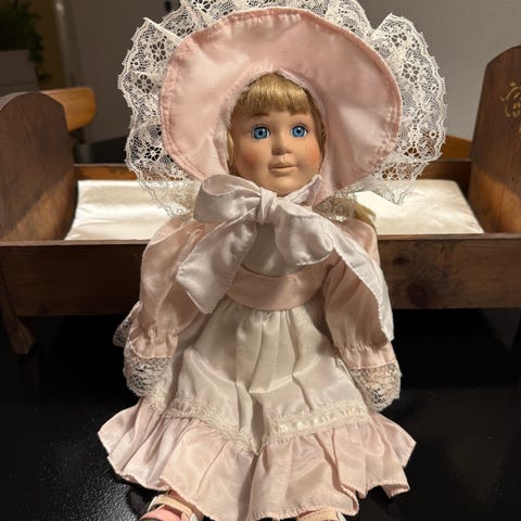 Legetøj, Dukkeseng . Dukketøj, Pusledukke . Retro legetøj . Seng . Super smuk original retro Pusledukke Seng . Rigtig flot vintage stand kr 100,- /Super skønt retro Pusledukke tøj sæt . Jakke og bukser. Kr 40,-