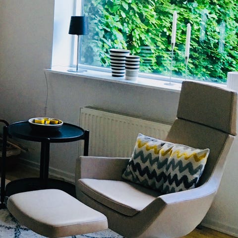 Fast pris for det hele, både stol, nakkepude og fodskammel: 8.995 kr. Afhentning i Århus C. Betaling via MobilePay.