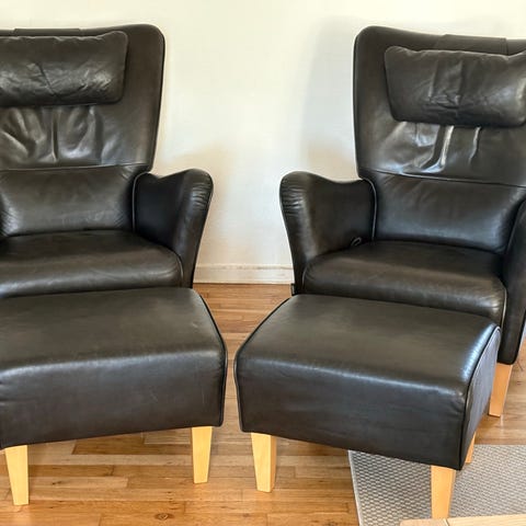 Fast pris for det hele, både stol, nakkepude og fodskammel: 8.995 kr. Afhentning i Aarhus C. Betaling via MobilePay.