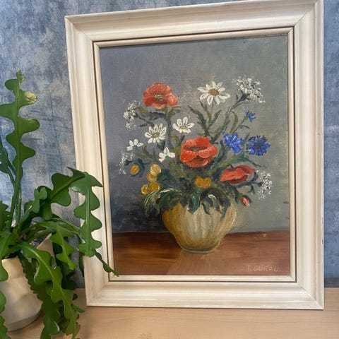 Fint blomsterbillede malet af Tina C. Møller. Måler med ramme ca. 23,5 cm. bred og ca. 25,5 cm. lang.