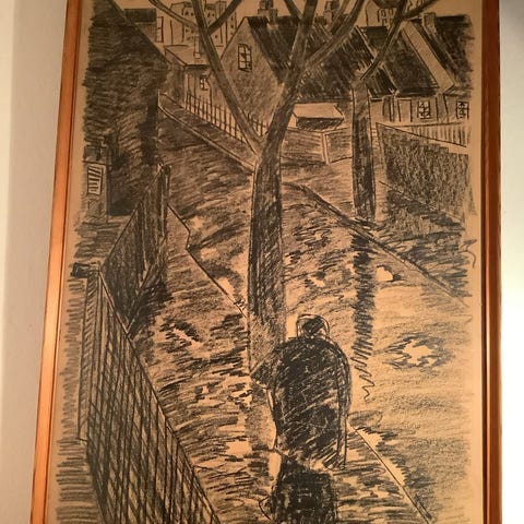 Kul, Bogh Laursen, b: 23 h: 16, Fineste tegning af Bogh Larsen. Forestillende Søndergade i Nørresundby. Signeret bagsiden. Pen på papir.