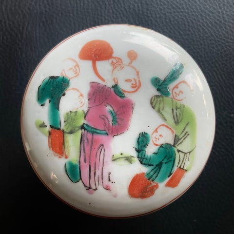 Porcelæn, Porcelæn æsk, Flot og håndmalet porcelæn æsk fra Jing De Zhen, Kina. Ø: 7cm, H: 4cm. Kan sendes!