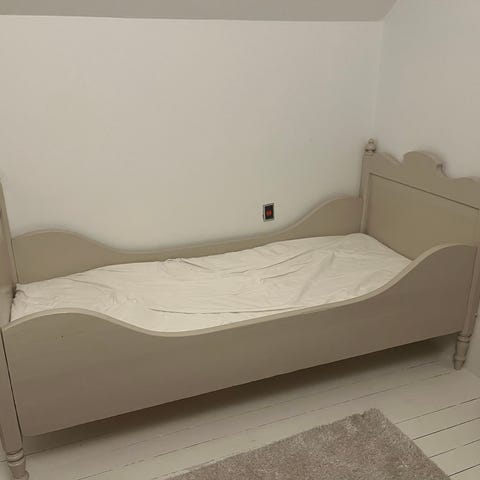 Sanders er et smukt møbel og af meget høj kvalitet. Med nærmest helt ny madras fra dansk mærke Sanders. Sengen blev solgt i “Et Hjem” i sin tid. Fabrikken er lukket permanent, og sengen produceres ikke længere. Nu har du mulighed for at købe den i særdeles god stand og med få mærker i rammen. Den er kun brugt til ét barn. Sengen står flot omend, der selvfølgelig kan være et par enkelte steder, hvor den har fået et lille slag således, at maling er gået af (se billeder).