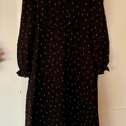 Dejlig kjole fra Levete Room i 100% viskose, lækker blød kvalitet. Beige/sort. Kjolen har bindebånd, så taljen kan fremhæves, slidser i siderne, ærmer kan smøges op og fæstnes med strop med knap.