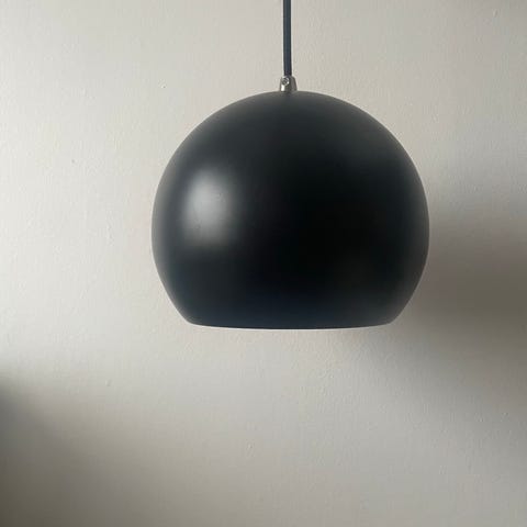 Pendel, Ball, Fin matsort kugle lampe med fræk 215 cm grøn stofledning. Diameter er 20 cm. Med fatning til elpære med stor sokkel/E27. Fuld funktionel stand, men en del overfladiske skrammer på lak - ingen dybe ridser eller buler.