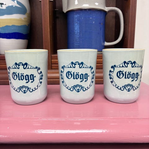 Et komplet Gløgg sæt med serveringsbowle og hele 21stk. krus. Alt sammen fra Knabstrup i en lækker retro grå farve med sort påtryk. På bowlen er der påtrykt en opskrift på Glögg.