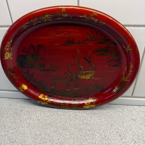 Rød oval bakke , metal , 120 år gl.