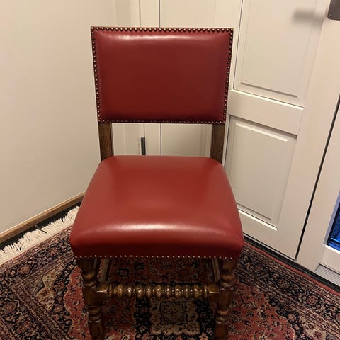 6 salonstole / spisebordsstole / cafestole med rødt betræk. Metalstel af 'guld'. Kan stables. Stand som ny.