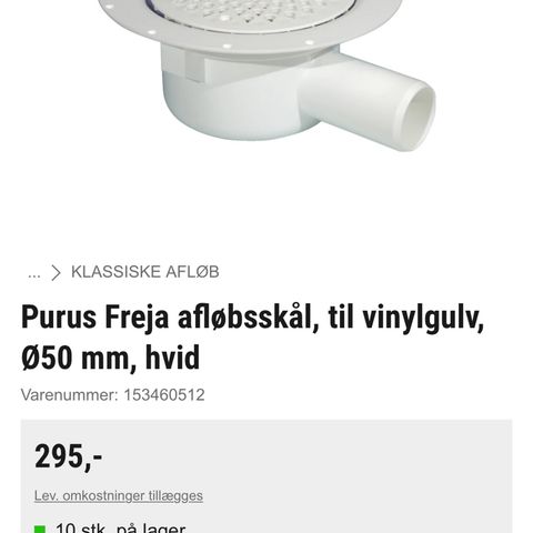 Andet, Pyrus Freja gulvafløb til vinyl, 150mm rustfri rist, til 75mm rør. Har ikke været monteret, men har lagt i nogle år med plastrør monteret på stuts. Nypris plus 400 kr.