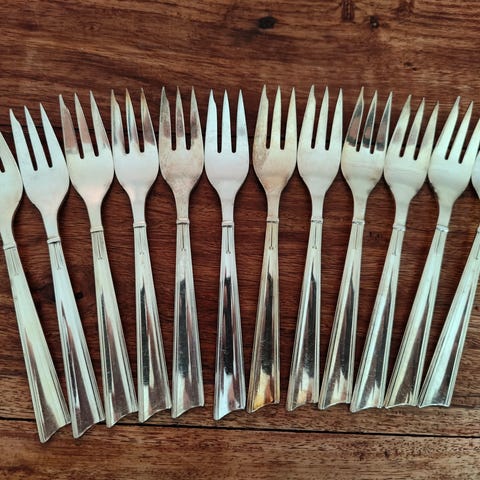 12 kniive 12 gafler 12 skeer 12 suppeskeer 12 dessert gafler 12 kaffeskeer 4 små skeer til salt og søde ting. 1 lagkagepalet.