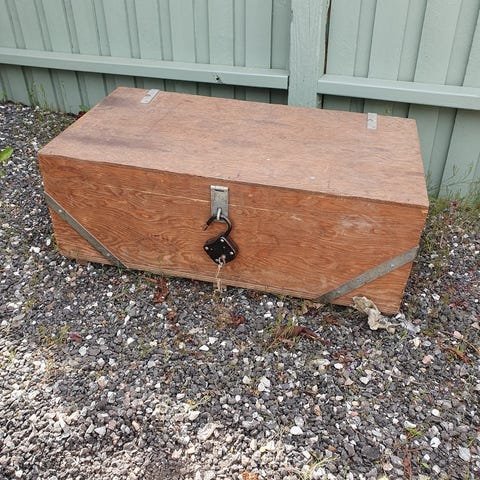Kiste, Kiste med stjerne. Og patina. Stof. Den er 32,5 cm høj og 59,5 x 35,5 cm