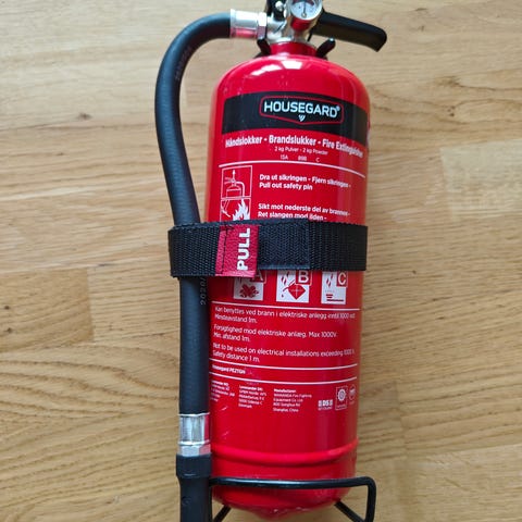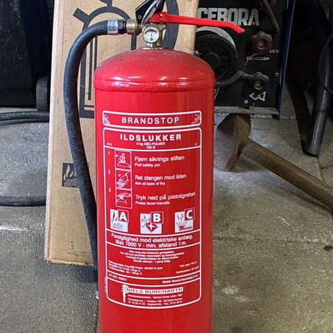 Pulverslukker, 6 kg pulverslukker. Uden eftersyn, men holder fint tryk. (Se manometer på billedet).