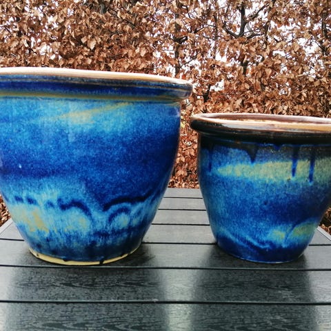 Brugt havekrukke med blå glasur.