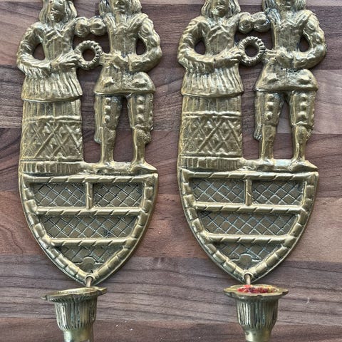 2 antikke lysestager af messing støbt med kvinde og mandefigur