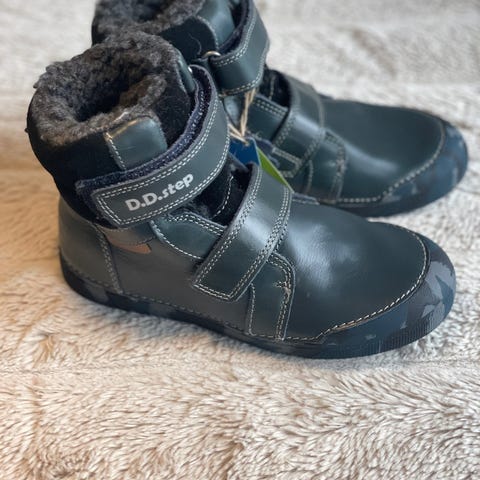 Seje D.D.Step vinterstøvler i blå nuancer med flot dragemotiv på siden. Støvlerne er fremstillet i ægte læder med vandafvisende overflade, som holder fødderne tørre på kolde og våde vinterdage.