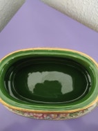 Keramik, Hånd dekoreret krukke, Italien, Meget smuk og dekorativ, hånd dekoreret krukke fra Taormina. Taormina er en bjerg by på den Italienske ø Sicilien. Længde ca 30 cm, bredde ca 18 cm, højde ca 23 cm. Krukken er lavet i glasur med krakeleringer, og efterfølgende håndmalet og dekoreret med fine farverige blomster og pyntet med knopper af sølv, samt fine kant borter med mønster. Indvendig har krukken en glat glasur, som gør den lækker til opbevaring af diverse. Desværre har låget en forholdsvis overfladisk revne i den ene side. Den er hverken synlig eller mærkbar fra indersiden af låget (se billeder). Jeg fik oplyst, at den havde haft den revne i adskillige af år. Tænker at den fortsat ved forsigtigt brug, vil holde måske et helt langt liv. Krukken virker meget robust. Der er også nogle afslag på indersiden af låget på kanten af krukken hvor låg kanten møder denne. Prisen er sat derefter. Krukkens alder er ukendt. Men formentlig meget gammel. Rabat ved køb af flere ting. Forsendelse er på købers ansvar. Men jeg pakker særdeles forsvarligt ind , i flere papkasser indeni hinanden, og rigeligt med stødabsorberende materiale i mellem, også omkring håndtag og toppen af låget. Kontakt gerne pr sms på 42 25 61 10 Pris