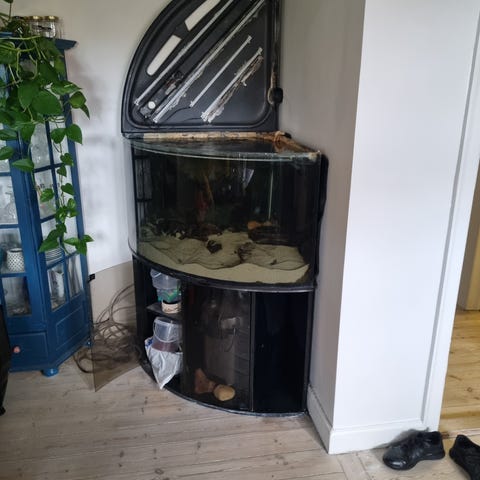 Højde: 114, stel 55 cm, akvarie 50 cm, top 7 cm