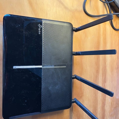 TP-Link Archer C3150 trådløs router med MU-MIMO teknologi. Denne router tilbyder hurtig og stabil internetforbindelse med dual-band support. Den sorte router har fire antenner for forbedret dækning og ydeevne, ideel til hjemmenetværk og streaming. Sælges da vi er gået over til fibernet, hvor router følger med. Vores router til salg har fint dækket ca 170 m2 lejlighed, så den er meget kraftig.