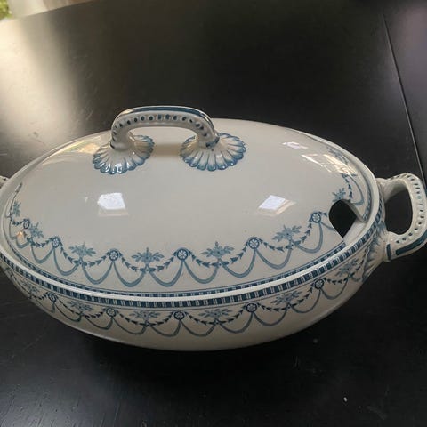 Porcelæn, Terrine, Lille fin Engelsk Terrine med ske, ca 1870., længde ca 22 cm, højde ca 10 cm, bredde ca 13 cm. Lille skår på kant, ikke synligt med låg, se fotos