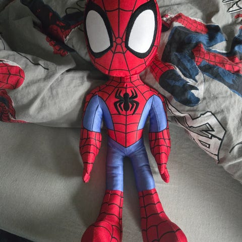 Spidey (Spiderman) bamsen kan sige 15 forskellige lyde ved at trykke på den ene hånd. Bamsen er behagelig og glatvævet kvalitet, så den er rar at sove med.