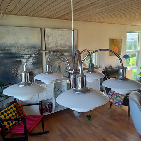 Lysekrone, PH BOMBARDEMENTSKRONE, Design af Poul Henningsen, produceret hos Louis Poulsen. Jubilæumsmodel fra 1999 i forkromet metal m/ 5. stk. 2/1 opalskærme. Mål: Ø: 68cm. Aldrig været i brug. Nummer indgraveret i fatningshus. Nummerbevis medfølger. Prisen er fast og afhentet.