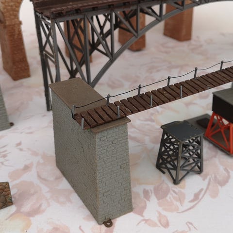 Modeltog, 3DGods - Alle er dele er 3D printet, Betondelene er printet med en mat grå plast. Trædelene er med 10-20% træfiber blandet i plasten, hvilket giver en realistisk overflade. Der er små ujævnheder i delene hvilket gør at de alle er lidt forskellige, modsat dem der er kommet ud af en støbemaskine. Overfladen er mat lidt ru så de er lette at patinere. Delene er max 28mm brede så de kan være på en alm. vogn, de mindre dele er 14mm så der kan være 2 i breden. Se også mine træ lastdele.