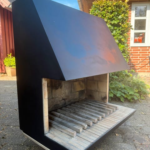 Cubus nr. 1 vægmonteret pejs af jernplader, indvendigt med ildfaste tegl, bagvendt udtag. Gnistfanger samt monteringsbeslag medfølger.