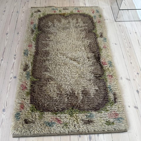 Gulvtæppe, Rya, b: 68 l: 115, Gulvtæppe, vægtæppe. Flottere end på billedet. Farver er åbenbart ikke så let at få på foto.