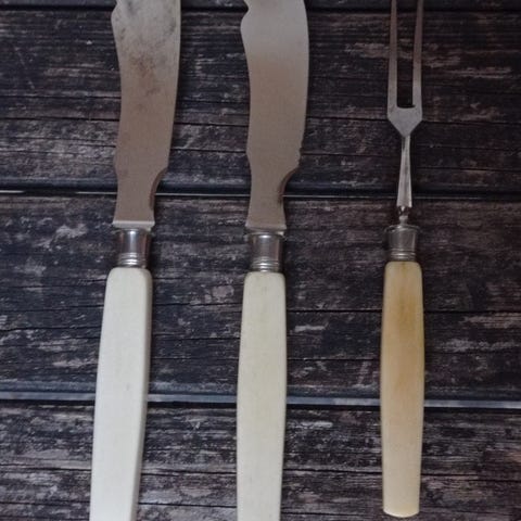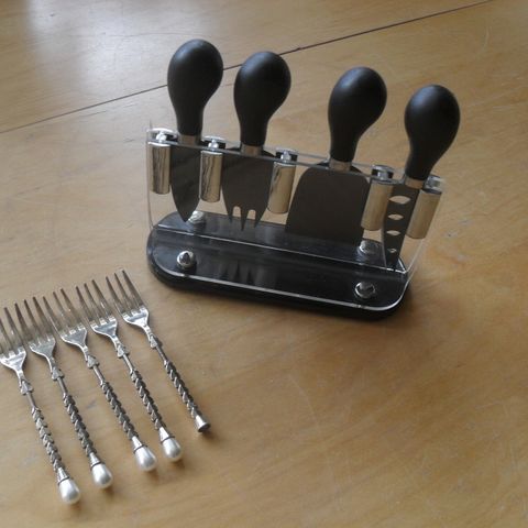 Bestik, Osteknive/ frugtknive, Solingen, 6 små, antikke knive til ost eller dessert. Knivene er i rustfrit stål og skafterne er i bakelit.